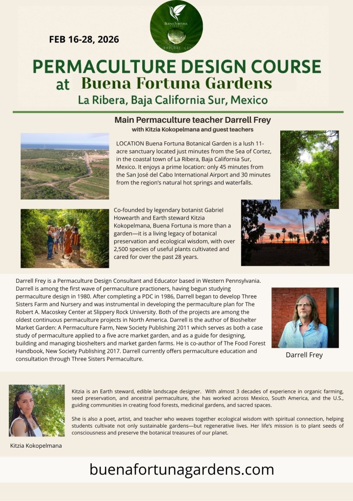Topics include permaculture design, food forest design and management, solar design, bioshelter design and management, alternative energy, water management, natural building, gardening, and more.